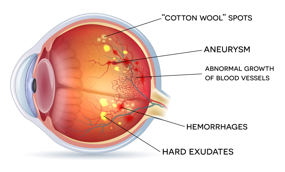 Diabetic retinopathy is a complication of diabetes caused by persistently high blood sugar levels damaging the retinal blood vessels. These vessels become weakened and leaky, leading to swelling or bleeding in the retina, and in advanced stages, abnormal blood vessel growth.